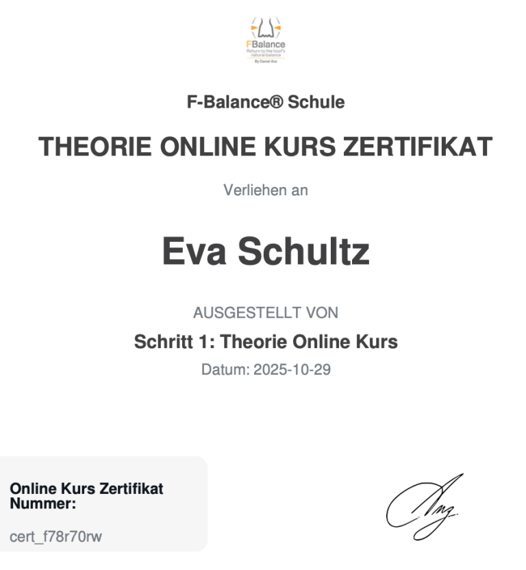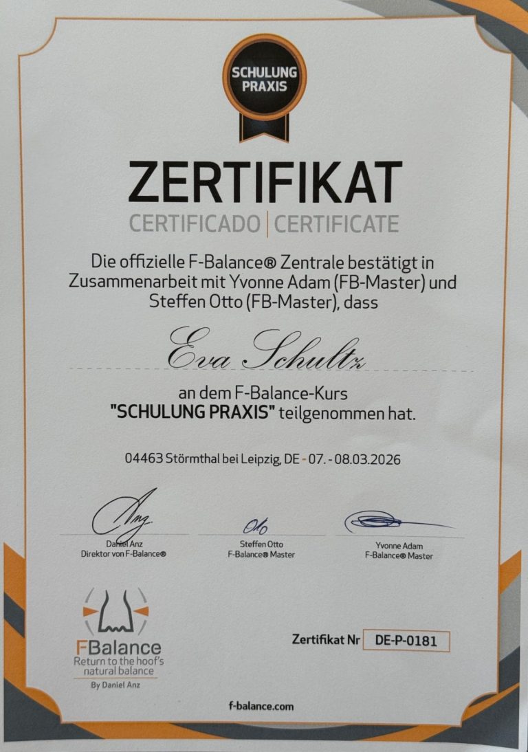 Zur Zeit mache ich eine weitere Foltbildung bei Jenny Hagen mit dem Ziel Huforthopädie, sowie eine Ausbildung zur Barhufpflegerin nach F-Balance by Daniel Anz die ich demnächst abgeschlossen haben werde. So werde ich das Pferd in einem Guss beurteilen und von den Ohren bis zum Huf auch behandeln können!
